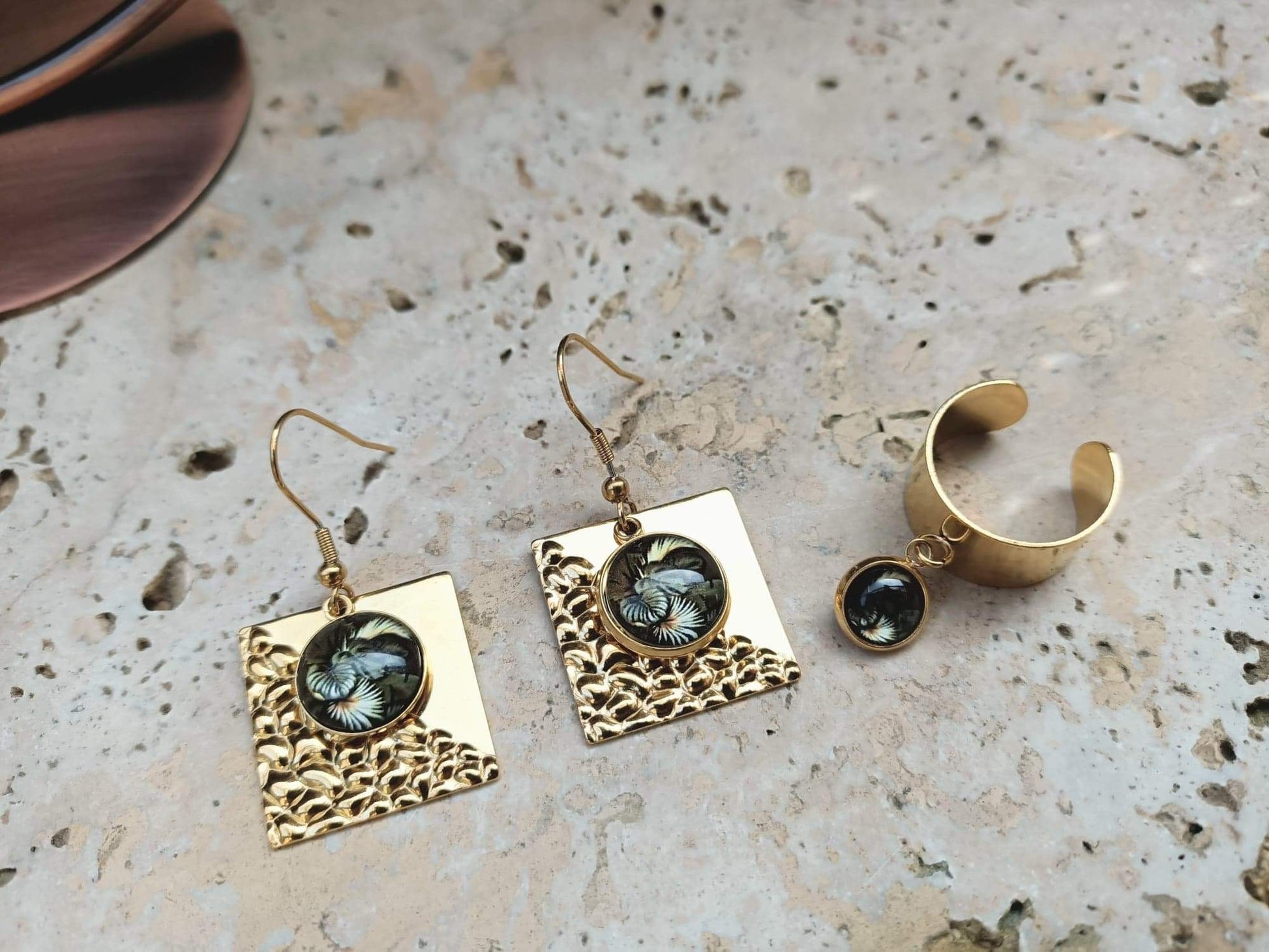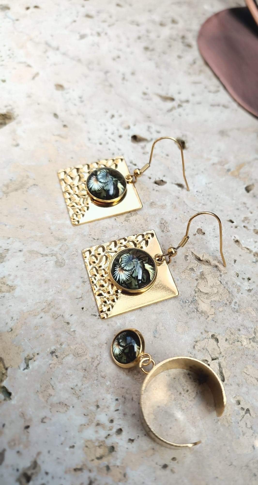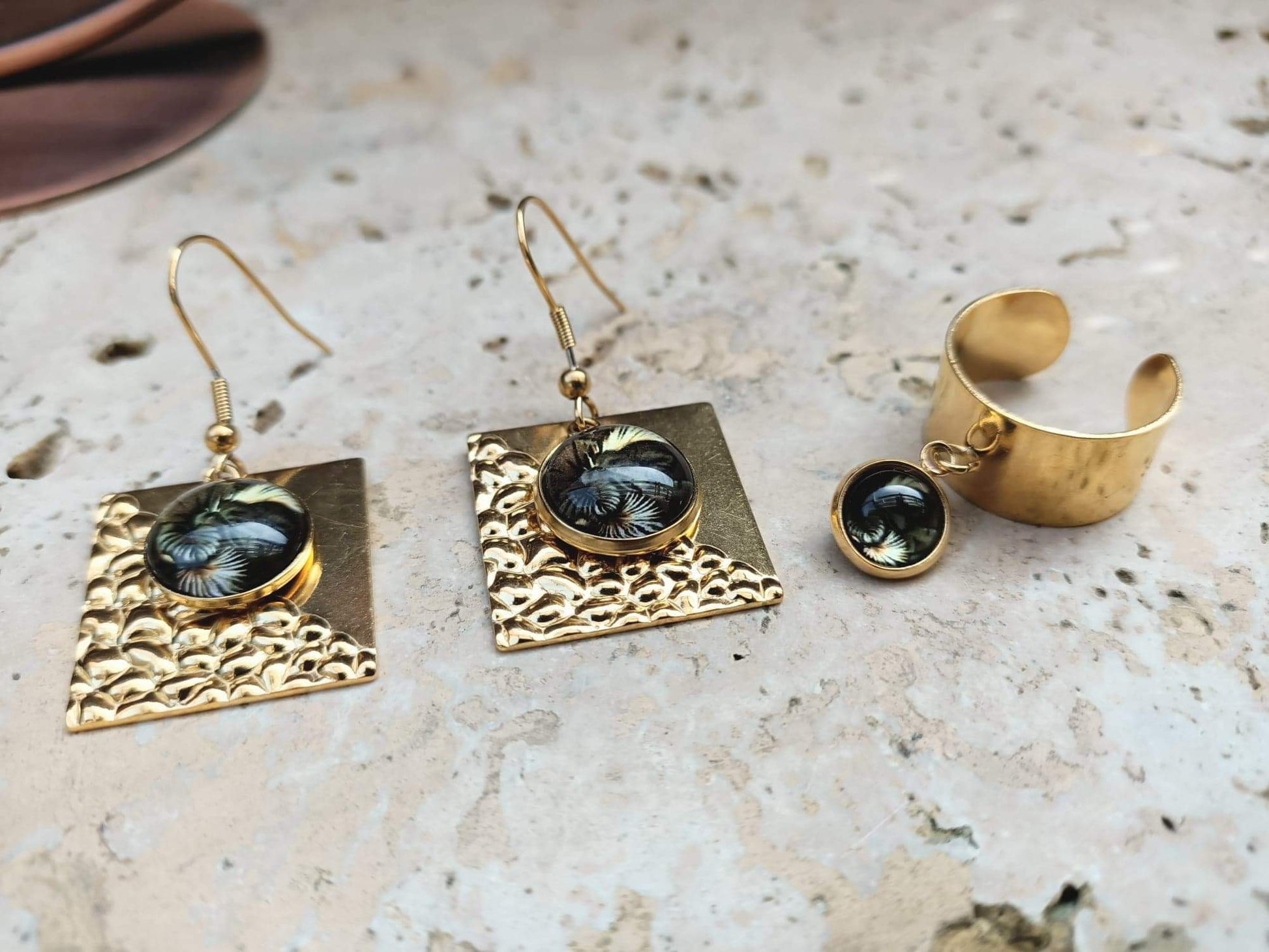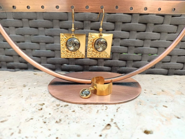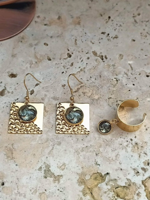 Boucles d'oreilles sur fond carré en acier inoxydable martelé en relief, breloque de forme arrondie en verre sur fond motif feuillages 3D.Bague réglable large avec breloque en verre de forme arrondie, intérieur motif feuillages 3D.
